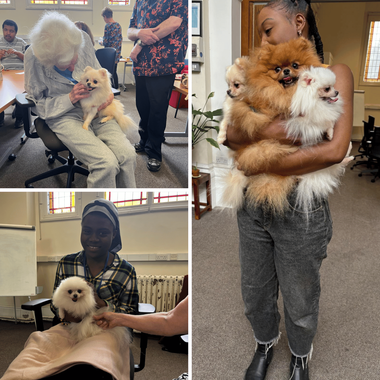 We were lucky enough to have a visit from these three adorable fur- balls, who attended our Tuesday Get Together session (Dementia Friendly, every other Tuesday 11-12.30). Their presence alone was enough to uplift spirits and create an atmosphere of sheer delight. Interactions with dogs has proven to be extremely beneficial to the mind, body and general wellbeing for all. Our attendee’s certainly enjoyed petting and cuddling them. We have Pat-a-Cake Paws back this weekend for our Jackynory session and again for Corbfest. We’d like to thank them for attending and bringing joy to our customers! https://www.patacakepaws.com/patacakepawsvisits